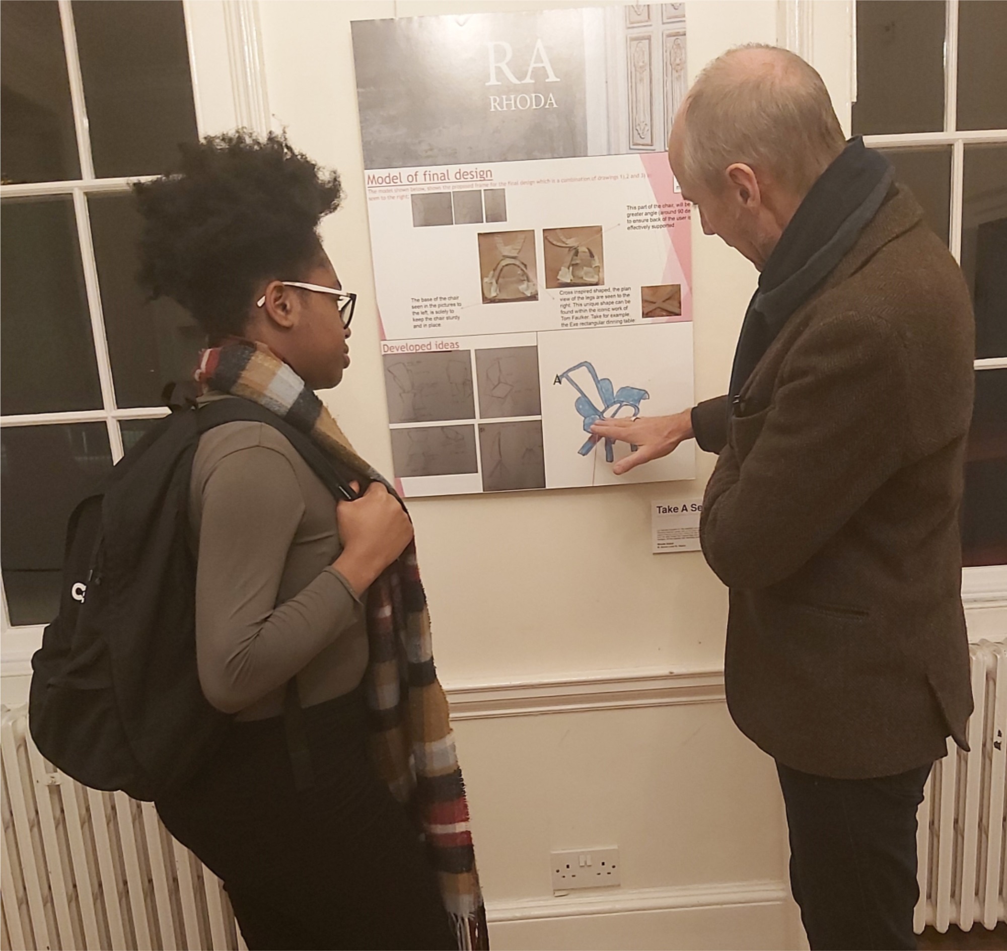 Both Rhoda and Anne-Elizabeth created excellent designs which meticulously followed the design brief and are full of flair and creativity. They were tasked with producing a case study of Toms work to help influence their designs while at the same time bringing in their own design styles. The winning design across all the schools was to be made into a full size prototype which would be unveiled at a private viewing.