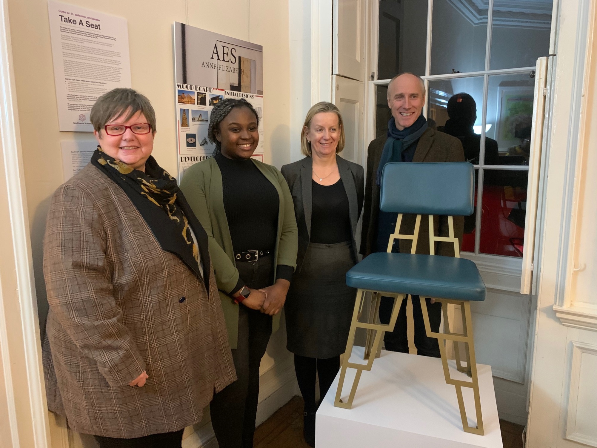 A mixture of excitement and apprehension filled both students and teachers alike as we attended the event at Bell House in Dulwich. The winning chair veiled in black fabric stood proudly in a corner as guests circulated the exhibition admiring the work of all the students involved. The outline of the chair masked by the cloth helped us narrow it down to about half the entries but is was the outstanding and beautiful design produced by our own Anne-Elizabeth which was finally revealed. The announcement by Tom Faulkner himself was met with rapturous applause from the whole room and the joyous reaction from Anne-Elizabeth made for an emotional moment. Anne-Elizabeth proudly stood by her chair for the lengthy photo call that followed. Both Anne-Elizabeth and Rhoda’s family were also at the unveiling and joined us in this exceptionally proud moment for both students.